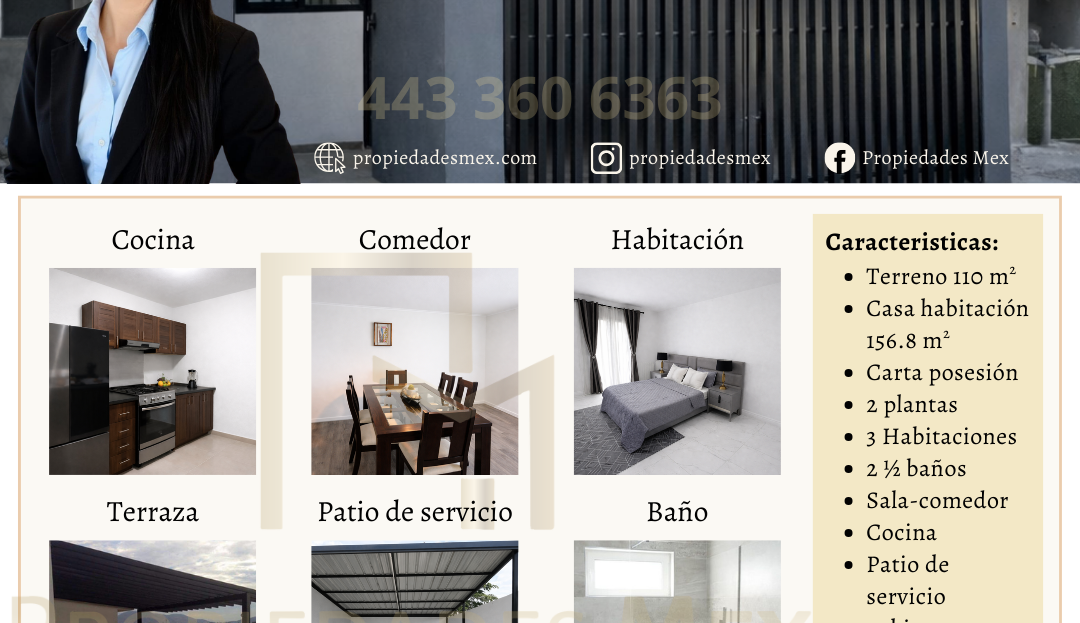 La vivienda cuenta con 156.8 m² de construcción sobre un terreno de 110 m², ofreciendo áreas amplias y bien distribuidas. Dispone de 3 habitaciones, 2½ baños, sala–comedor, cocina, patio de servicio cubierto y terraza, además de estar construida en dos niveles, lo que permite aprovechar mejor cada espacio de la propiedad.
